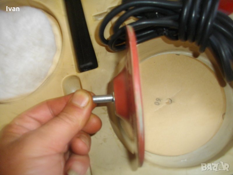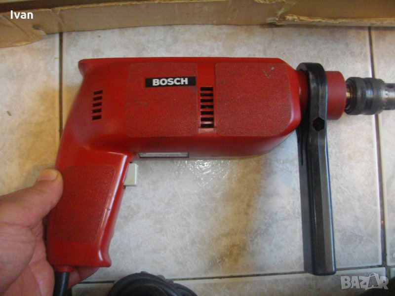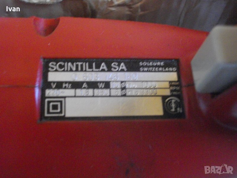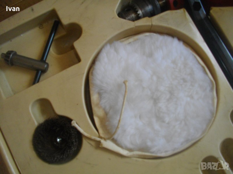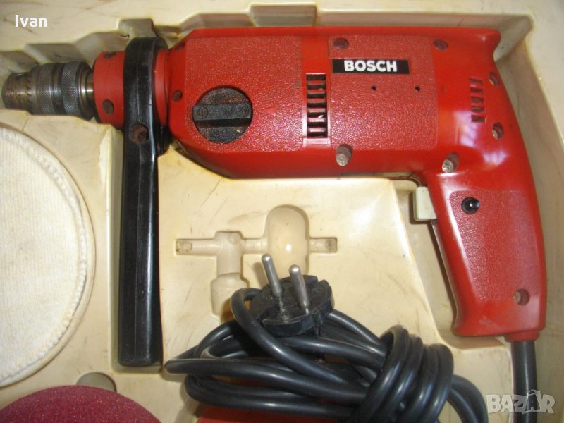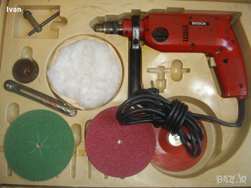 Професионална малка, удобна дрелка-бормашина, оригинален профи швейцарски модел на Бош, с различни приставки, към нея. Марка и модел на машината - Bosch Scintillа SA. Производство-оригинално Швейцария - Switzerland - упоменато на фабричните маркировки. Комплекта е от старото висококачествено произовдство на марката, което вече не съществува. Запазен външен вид на бормашината, почти нова, в отлично техническо състояние. Всички функции работят нормално. Няма никакво искрене на ниво четки, ротор, статор. Няма смущаващи вътрешни шумове, луфтове, тракане, виене ,свистене. Мощност на машината - 380 вата, голяма защита -1,8 ампера. Обороти - 1000/минута.Трептения на празен ход - 3300/минута.Корпус на машината - твърда качествена бакелитова пластмаса, от старото качество. Автостоп на спусъка. Регулация обороти - чрез натиск върху спусъка-плитко-дълбоко.Две скорости. Функция пробиване и функция удар-символ чук.Патронник-оригинален на Бош-Германски, упоменато на него. Тип метален -- за ключ. Ноличие на оригиналната бакелитова твърда предна държка към машината. Към машината е наличен оригиналният ключ за патронника. Налична е гумената приставка с адаптол за шлайфане и полиране. Приставката е нова, размер ф125 мм, неизползвана. Налично е 1 бр. оригинално кече - чорап за приставката, за полиране и пастиране на метални повърхности, ламинати, стъкла. Кечето е тип естествена вълна, с дължина на косъма 20 мм, захват на кечето -връзки. Налични 2 броя оригнални шкурки за шлайфане - р60 и р80- стандартни на Бош, от старото качество.Шкурките са нови. Налична 1 брой телена четка-