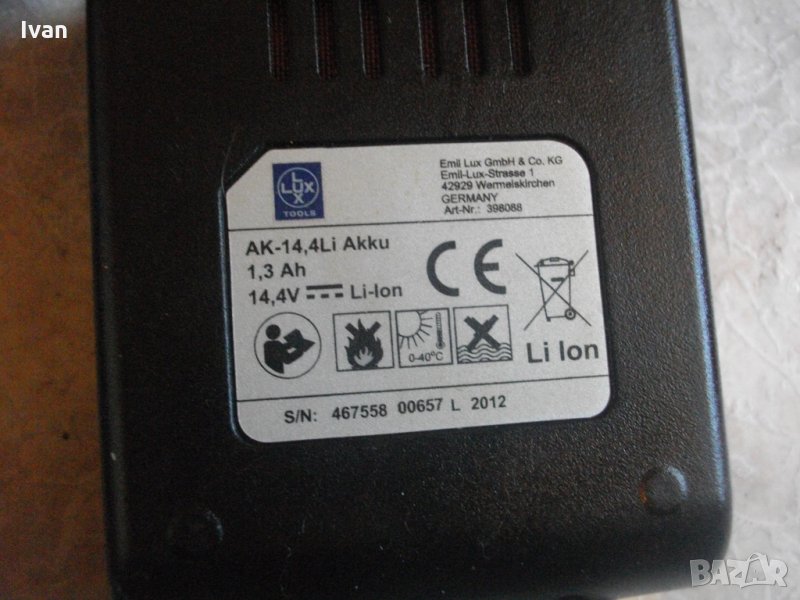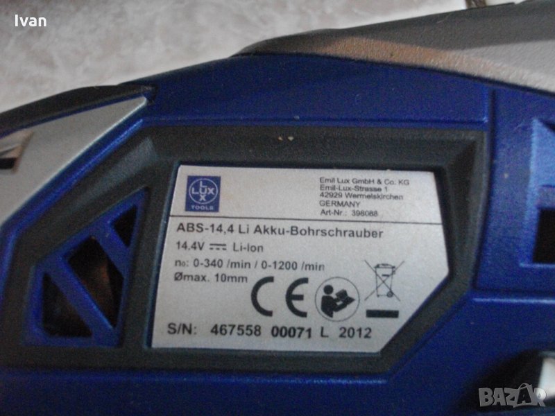 Съвсем нов силен и мощен,масивен 14,4 волтов винтоверт-дрелка,акумулаторна бормашина,литий-йон технология,професионален немски модел.Оригинално немско производство на концерна Lux Tools,2012 година,упоменато на фабричните стикери. Марка и модел-.ABS-14,4 Li-Akku-Bohrschrauber.Машината е професионална-с метални части вътре,издържащи на по-големи натоварвания.