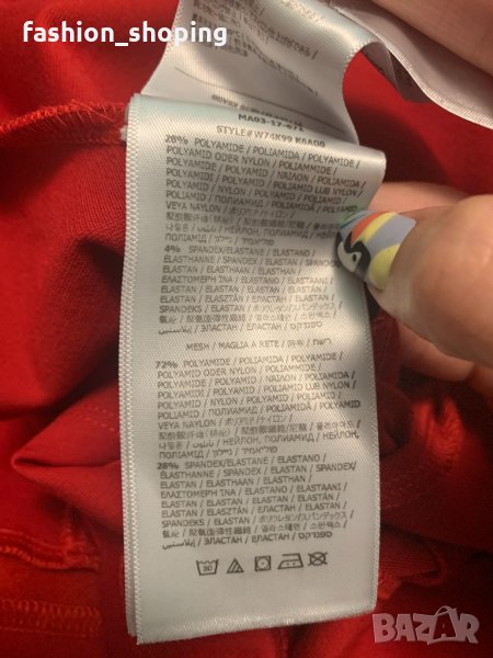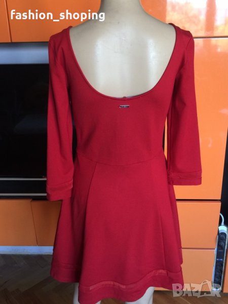 Страхотна, секси червена рокля на американския бранд Guess. Наситен огнен, червен цвят, с кройка подчертаваща женските достойнства- съблазнително деколте и частично изрязан гръб, следваща талията. От кръста надолу се разкроява и придава женственост. Допълнителни детайли, допринасящи за красивата визия на роклята са ивици от воал в същия цвят на ръкавите и в долната й част.