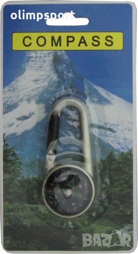 Карабинер с компас на блистер. Тегло: 40г. Р-ри: 6.5х3х0.8см. Лек, удобен, практичен. Цвят: сив.