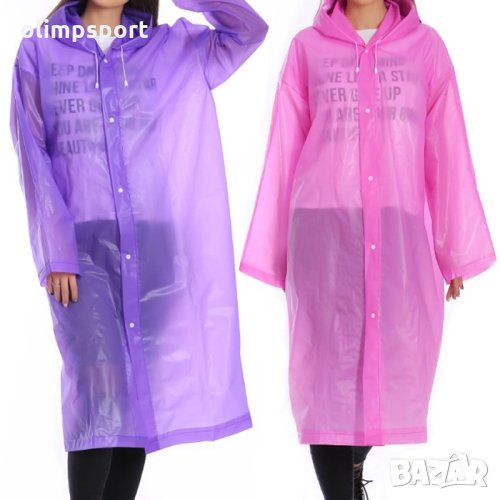 Дъждобран с ръкави и качулка, изработен от найлон. Закопчаване с тик-так копчета. Връзка за пристягане на качулката. Един универсален размер - дължина 115 см, ширина 68 см. Различни прозрачни цветове.