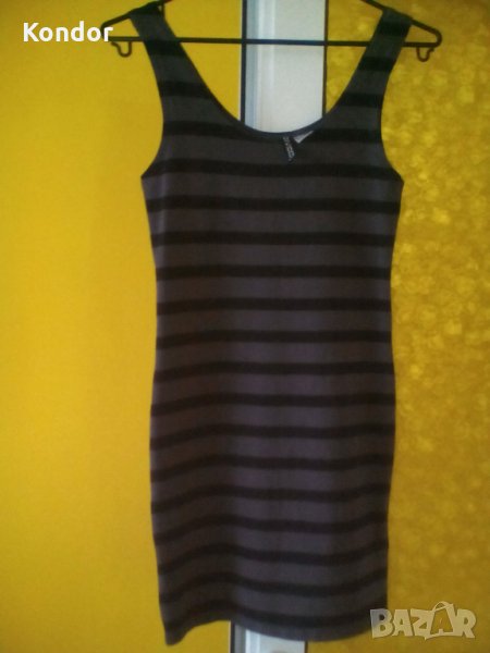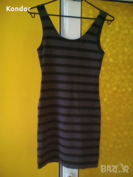 райе. С обло деколте тип потник.Дължина на роклята 61 см. Широчина на раменете 32 см. Ръкавна извивка 23 см. + 23 см. Обло деколте с дълбочина 15 см. Деколтето горе е 24 см, долу 10 см.Талията е 60 см неразпъната, а ханша е 70 см неразпънат.