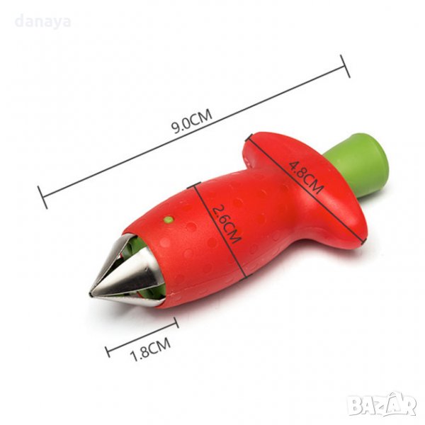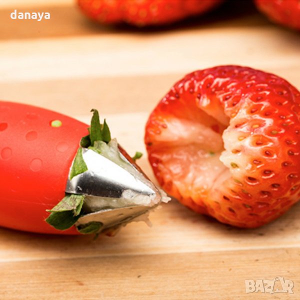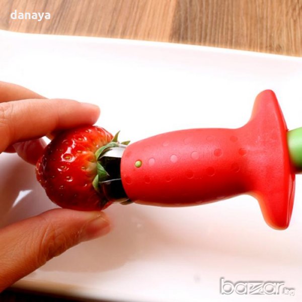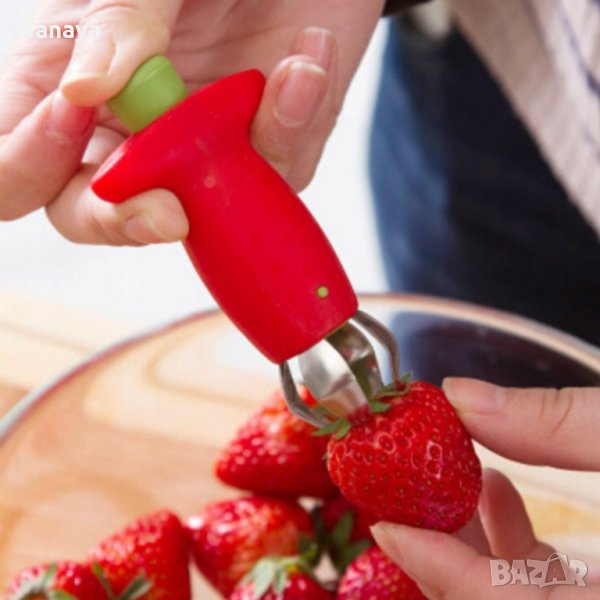 Ръчен уред за чистене на зелените дръжки от ягоди и малки домати. Малък, удобен и практичен кухненски инструмент. Този очистител на дръжки от ягоди или доматчета е лесен за използване. Просто забийте острието в плода, след това натиснете бутона, завъртете и издърпайте навън.