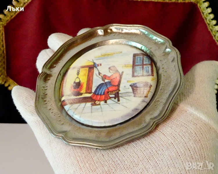 сребро,маркирана.В центъра има апликация от порцелан с ръчно рисувана цветна картина Предене на вълна с хурка и вретено пред камината.Диаметър 10.5