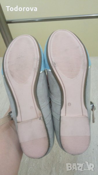 Чисто нови балеринки в синьо, сребристо и сиво. Много леки, елегантни,подходящи и за летните вечери. Пробвани вкъщи. Не успяхме да ги носим, т.к. крачето премина сезона.С каишка и ластичен за еластичност при по-висок свод. Стелка-21.5 см.