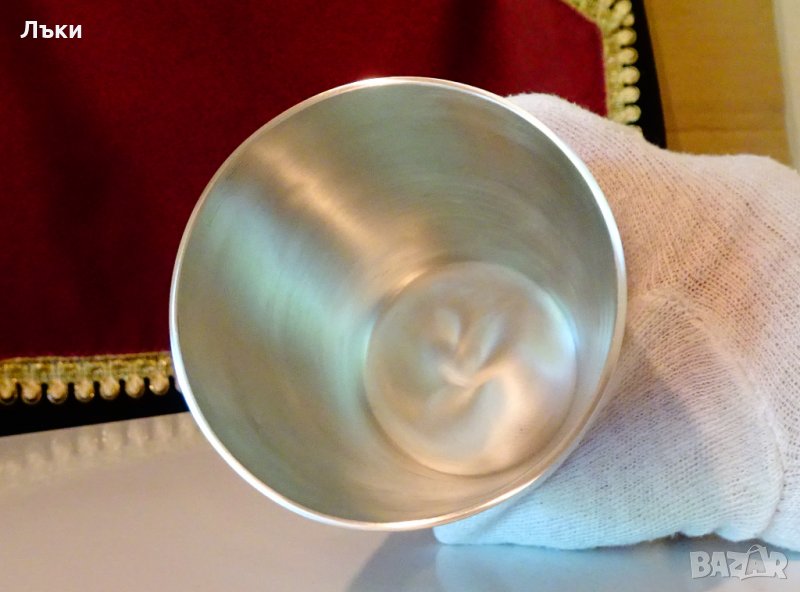 и 5% сребро,маркирана.Декорирана с релефни цветя и орнаменти.Калаят е идеален материал за чаши и