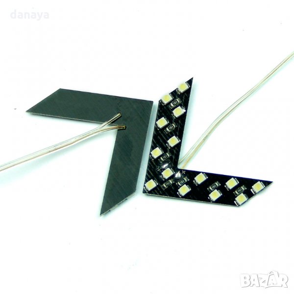 стрелки за огледало на автомобил. Диодни мигачи тип стрелки, които се поставят под огледалото и при пуснат мигач премигват. Светят ярко. От мигачите тип стрелки имат два броя кабели за свързване. Поставянето е елементарно, просто свързвате с мигача на автомобила или мигача на огледалото при по-новите автомобили. При по-старите модели автомобили е необходимо да се изкара ток от самия мигач до огледалото или от таблото на колата като е по удобно. Мигачите тип стрелки работят на 12V, съвместими с всички марки автомобили.Универсални са и стават за всички огледала на автомобилите. Придават съвременен и интересен вид на автомобила, имат предупредителна функция за намерението ви да завиете на участниците в движението зад вас.