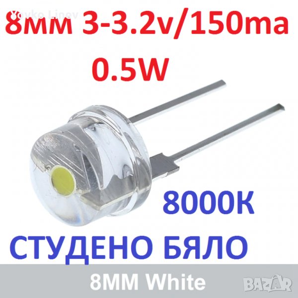 LED 8mm СВЕТОДИОД - СТУДЕНО БЯЛО - 8000К - 0.5W 3-3.2V / 150ma 20-БРОЯ → Обява 33281721