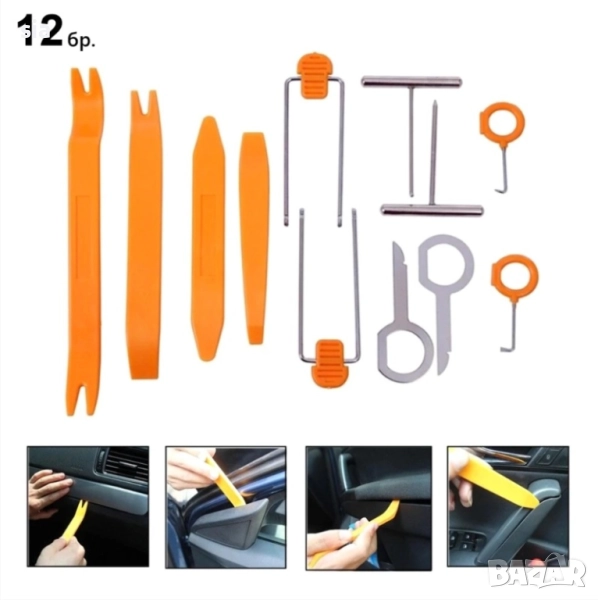 Комплект щанги/ инструменти за демонтаж интериорни елементи. За вадене на щипки от кори на вратите, подкалниците, лайсните и др. Комплекта се състои от 12 части.