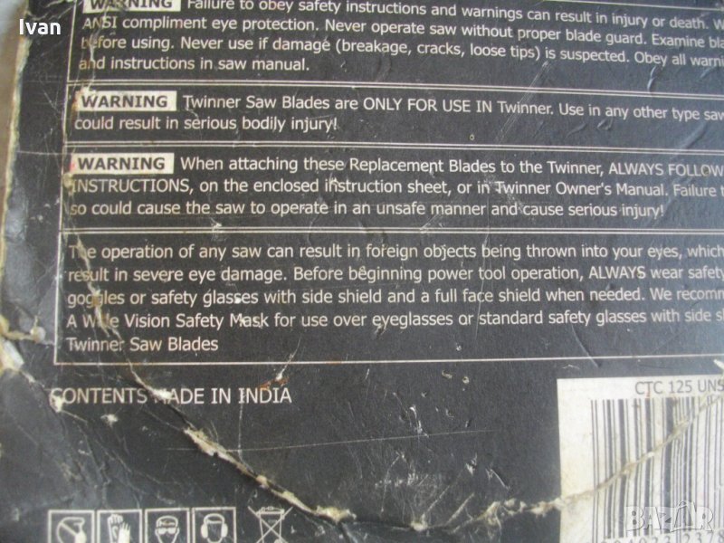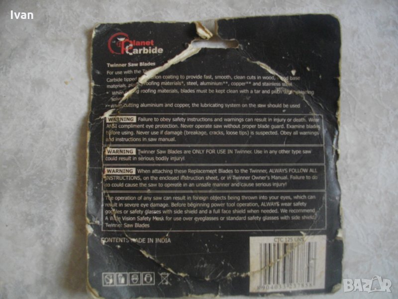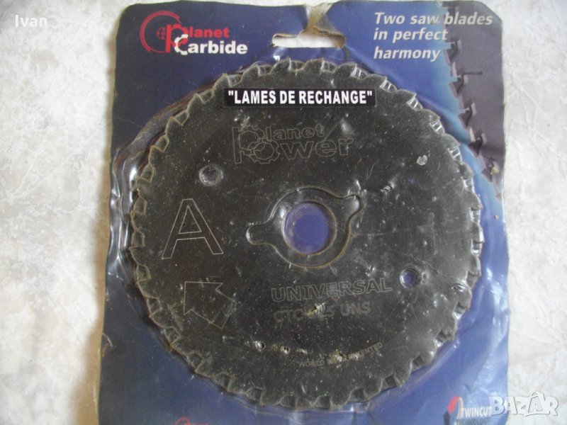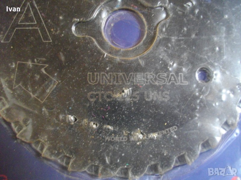 Съвсем нов,запечатан режещ диск-мултифункционален за рязане на алуминий,пластика,желязо,дърво,плочи,керамика.Размер външен на диска-ф125мм.Вътрешен размер на захвата-ф18мм..Диска е с 2 остриета,с движещи се срещуположно зъби.Диска е от материал карбид,с тефлоново покритие,упоменато на описанието.марка на диска-Universal CTC 125 UNS.Производство-Индия..За машини