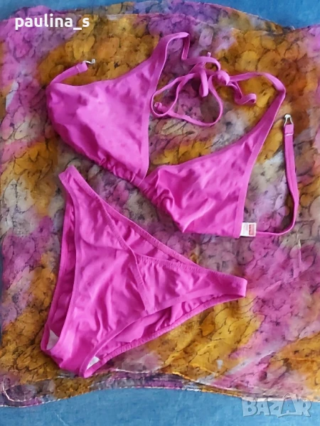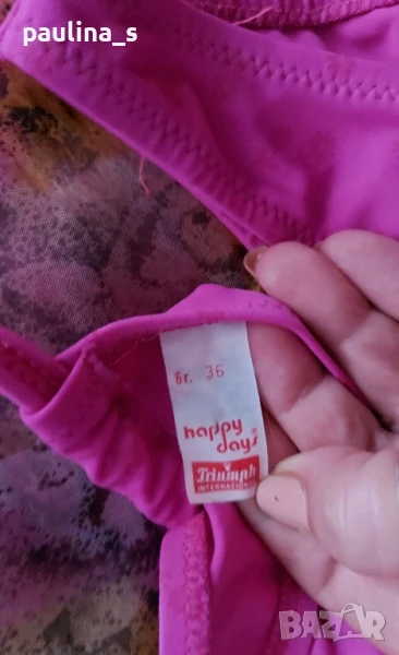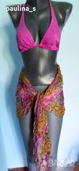 2️⃣ Розов Комплект "Triumph" с парео. Цената е крайна 39,99лв / 20 евро. Бански комплект "Triumph" happy day - От S до XL с подарък парео. Принтът е на цветя, а цветът е транслуцентен, нюансите се менят на светлината. Не е чисто нов, но е без дефекти! Пареото е индийска ръчна изработка, материята съдържа коприна, но махнах етикета, защото стърчи.