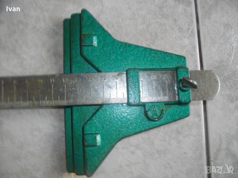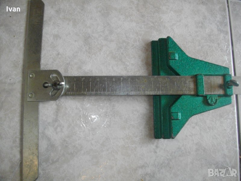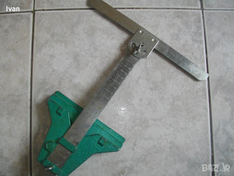 плот.Приспособлението е съвсем ново,неизползвано,с фабричните етикети и стикери по него.Оригинално немско производство. Маркирана немска цена на стикера-22,95 марки.Марка на линеала-ъгъл-Jokosit.Линеала е метален изцяло,разграфен до 20 см,като отзад остават още няколко сантиметра.Отпред линеала е с ограничител за ширина при рязане,с наклон,регулируем,посредством крилчата гайка.Линеала и ъгъла са захванати на масивна метална основа,която се прикрепва към плот на машина,с която се работи.Цялостна дължина на приспособлението-30см,ширина при основата-14см.Ширина на ограничителя-25см.
