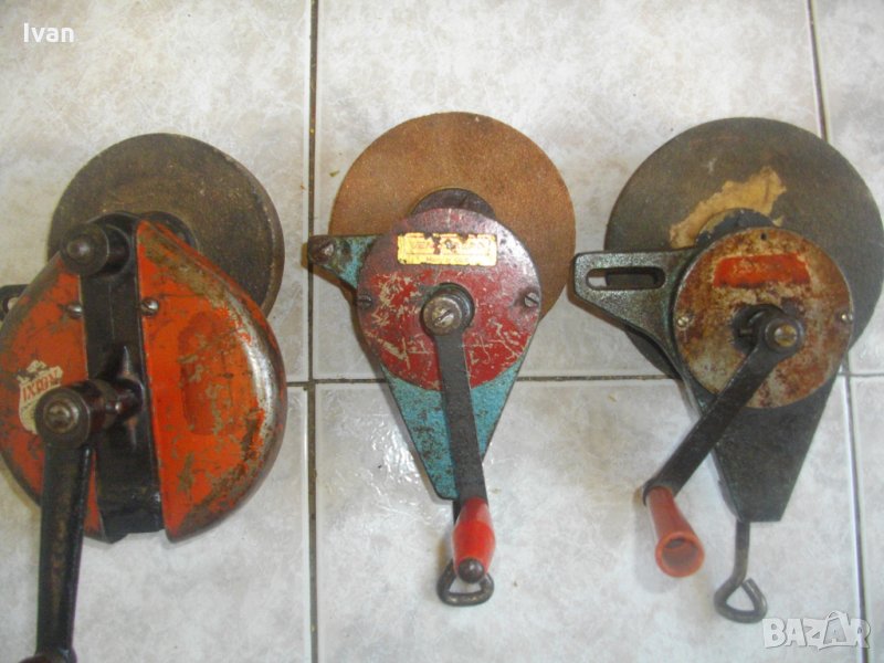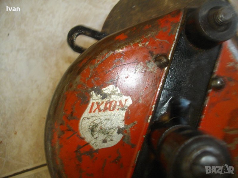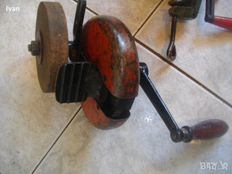 Описание на голям немски оранжев цвят, размер ф 160мм шмиргел - марка Ixion. Цена 129 лв. Голям профи ръчен шмиргел,с възможност за камък-диск до 160мм.Инструмента е немско оригинално старо висококачествено производство. Марка-Ixion.Голям корпус-16см,изцяло масивен,от дебело желязо.Шмиргела върти съвсем леко и силно,вдига бързо голяма скорост.След пускане на дръжката въртенето продължава продължително.Със запазен външен вид е и отлично техническо състояние.Работи много добре.Дръжката е с масивно орехово лакирано покритие.Поставен е оригинален камък-диск,кафява мека съвсем ситна пясъчна зърненост,с диаметър-ф125мм,дебелина-20мм.Има възможност за поставяне на камък-диск до 160мм.
