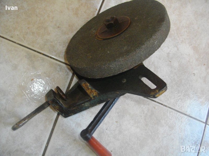 Описание на немски ф 150 мм шмиргел. Цена 129 лв. Голям ръчен шмиргел за шлифоване и заточване.Старо здраво,кораво,високо качествено немско производство. Инструмента е със запазен външен вид и отлично техническо състояние.Работи много леко-въртенето е силно,мощно,след пускане на ръчката продължава по инерция доста продължително.Основата е изцяло метална,от дебело масивно желязо.Завършваща със стяга за захват към работна маса или плот.Размер за захват на стягата-до 40мм.Цялостна височина на инструмента без диск-22см.Дръжка-върток-метална,масивна,с твърдосплавна пластмасова покритие.На шмиргела е поставен голям оригинален шлифовъчен камък-диск-размер ф150мм,тъмно сив мек пясъчен абразив.Диска-камък е почти нов,няма никакво износване.
