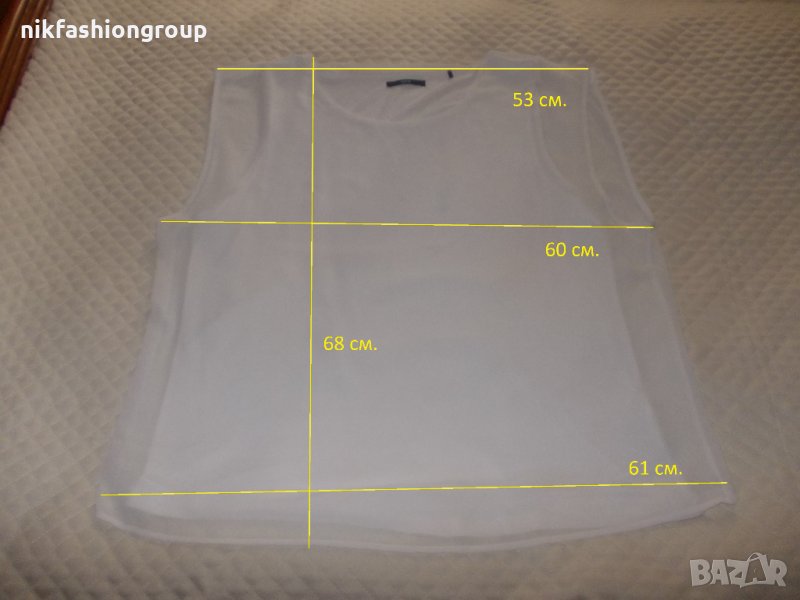 Долната част /потниът/ е 95% вискоза и 5% еластан - и е еластична. Потникът не е нов, но няма никакви следи от употреба. В отлично състояние е. Не прозира. По етикет е размер 44, което отговаря на Л / ХЛ. Размерите са показани на снимка.