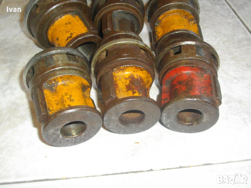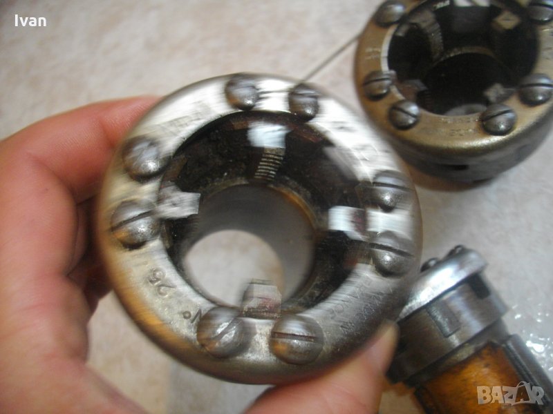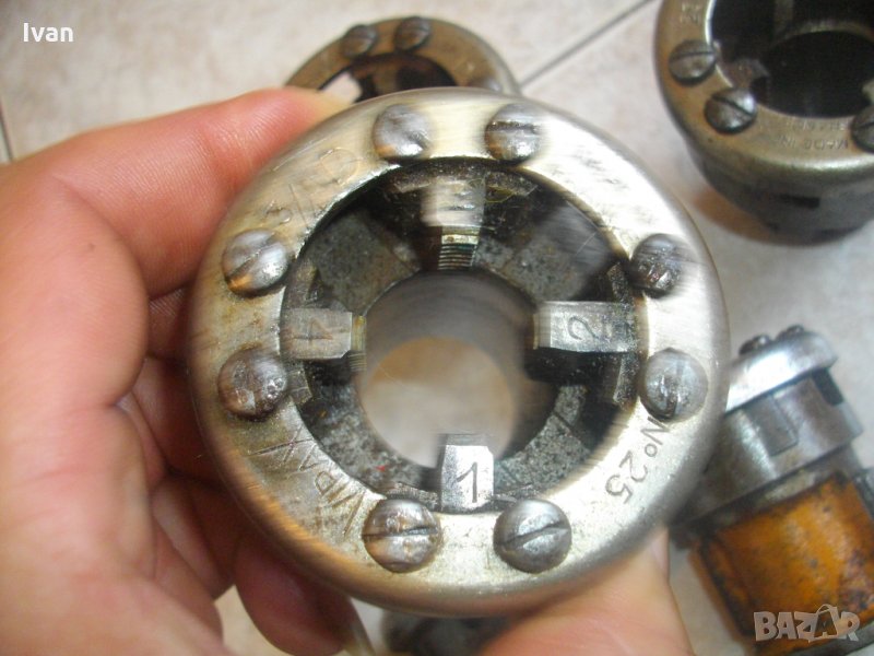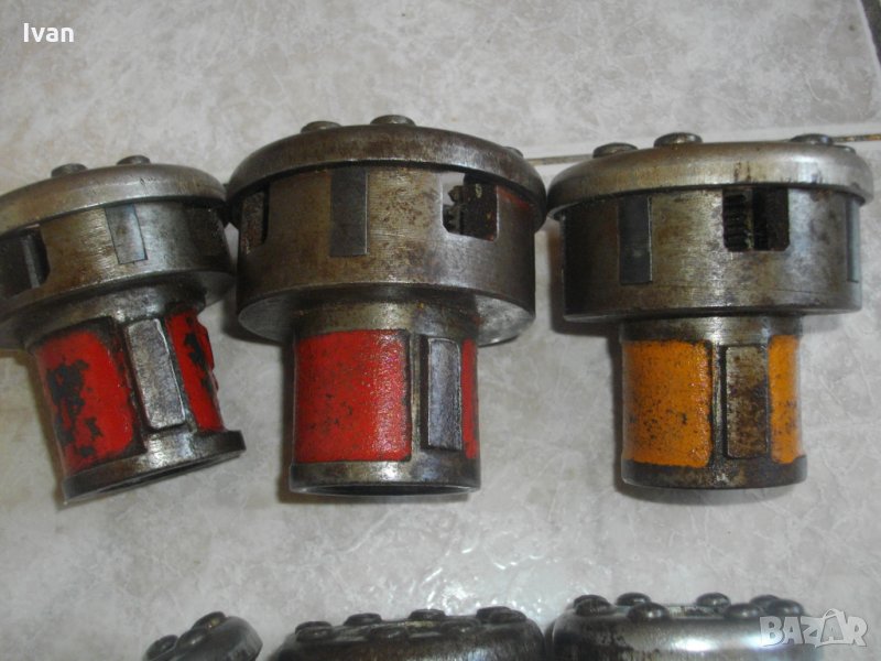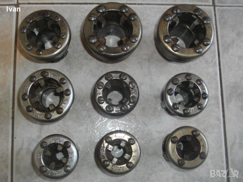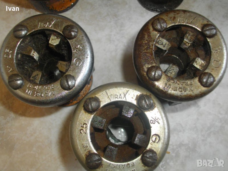 винтонарезна глава с ножове от обявата. Главите са професионални,оригинално френско производство на Виракс,упоменато с маркировки.Марка-Virax.Със запазен външен вид са и в отлично техническо състояние.Режещите ножове са много добре фабрично заточени и нямат никакво износване.Главите и ножовете в тях са изработени от специална висококачествена стомана с дълъг живот.Размери на главите-3/8 цол-3 броя,1/2 цол-2 броя,3/4 цол-2 броя,1 цол-2 броя.Имам и 1 брой глава 1цол марка Ridgid.Главите Виракс са с два чопа-зъби, за захват отдолу , към тресчотка рамо-държач/стандартните червени глави Виракс за ръчни винтонарезки са с 4 чопа-зъби. Отгоре болтовете на главите са 8 или 4 болта/ 4 болта са за ръчни тресчотки рамена на винтонарезка/. Главите от обявата са за електрическа винтонарезка, не са за ръчна. Диаметъра на главите е по-малък, от диаметъра на главите за ръчни винторезки Виракс. Разполагам и с глави Виракс за ръчни винтонарезки от марката , които са с 4 зъба-чопове за захват в държача-рамо, и 4 болта отгоре - стандартни червени глави.Нови - на цена 99 лв за брой , и ползвани на цена -99 лв за брой.