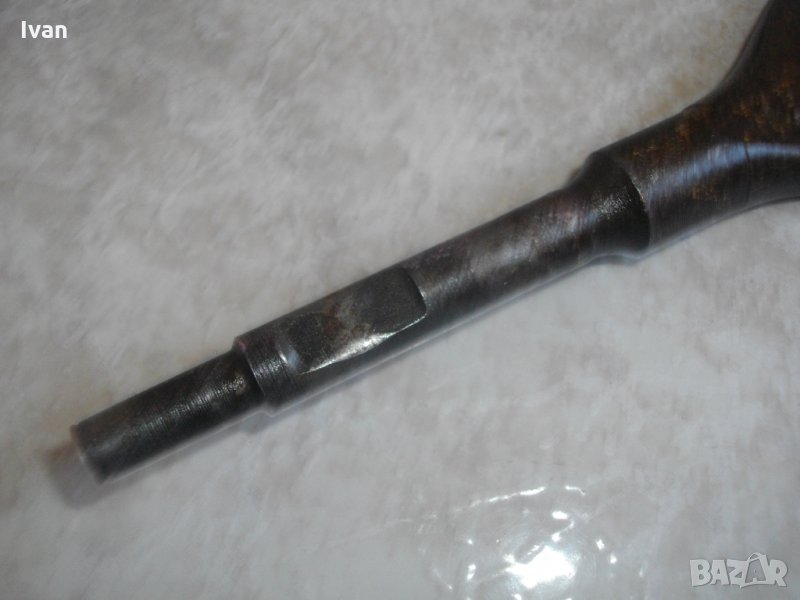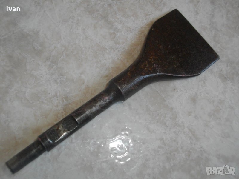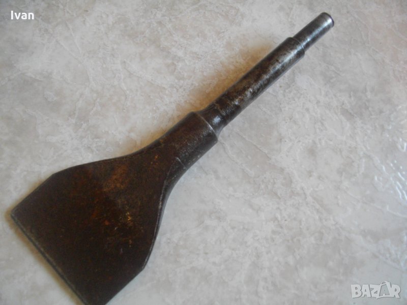 Масивно здраво,качествено длето-шпакла,аксесоар,със захват към патронник-обикновен с ключ,или самонатягащ..Приложение-за стържене на мазилки,гипсови шпакловки,снемане на тапети,фаянсови керамични плочи и други дейности.Длетото е голямо,от дебела масивна стомана.Немско производство. Цялостна дължина на шпаклата-137мм.В машината влиза 5,5 см.Ширина на лопатката за работа отпред-43мм.Отзад длетото е с кръгъл диаметър за поставяне и притягане към патронник.