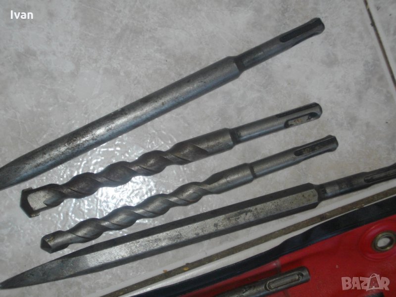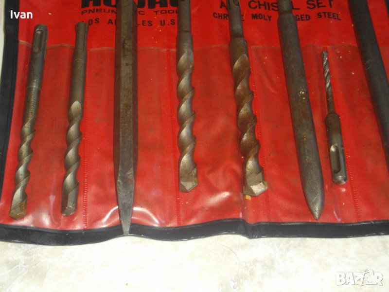Комплкта включва 3 броя пробой-заострени /единият е съвсем нов, двугите два-малко ползвани. Отделно 1 брой нов скосен заоблен дълбач с жлед и улей за отпадъчната прах - съвсем нов. Отделно 5 броя различни бургии - свредла видирани за бетон /4 нови и 1 малко ползвано/. Комплекта е прибран в оригинален САЩ производство калъф силиконов марка RODAC - Los Angelis - USA.