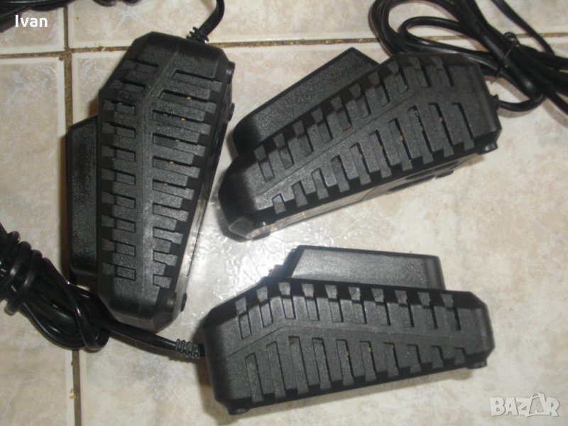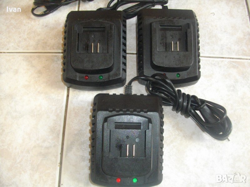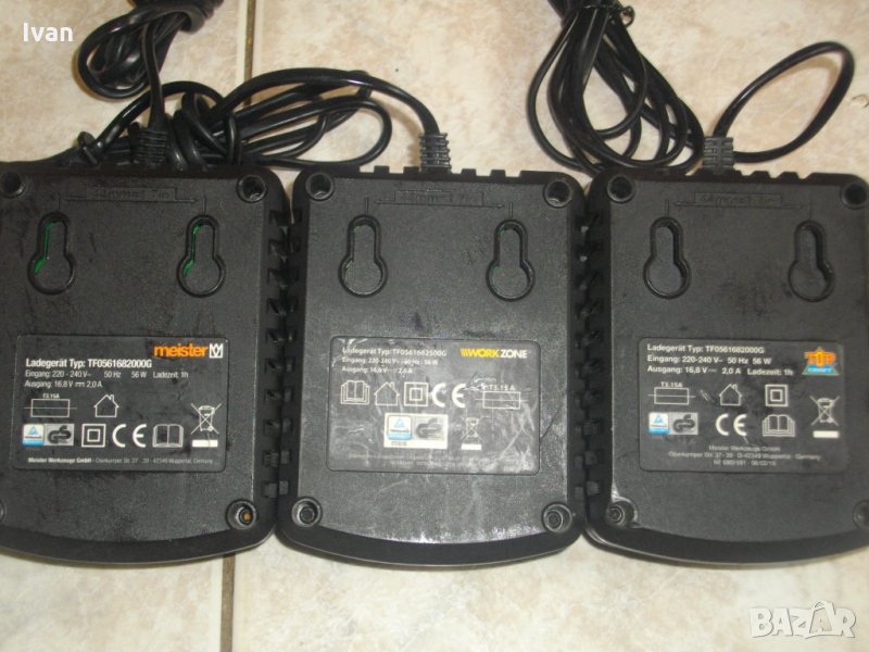 Зарядните не светнат при включване.Не са тествани от техническо лице-не мога да определя проблема.Зарядните са за повечето марки батерии Li-ion-немски,холандски,австрийски,белгийски,френски-Workzone,Top Craft,King Craft,Meister Craft,Duro,Workzone,Basic и прозводните им марки.Зарядните са 16,8 волта-2,0 ампера,56 вата.Време на зареждане-1 час.Всички зарядни са немско оригинално производство,упоменато с маркировки.Марки на зарядните 16,8 волта-Workzone,Meister.Top Craft.Workzone.2 светлинни индикации-зелена и червена.При включване без батерия-зелената трябва да свети непрекъснато.Тя не светва.При поставена батерия-червената свети за зареждане.Не светва. НАЛИЧИНИ 3 БР. ЗАРЯДНИ ОТ ВИДА.