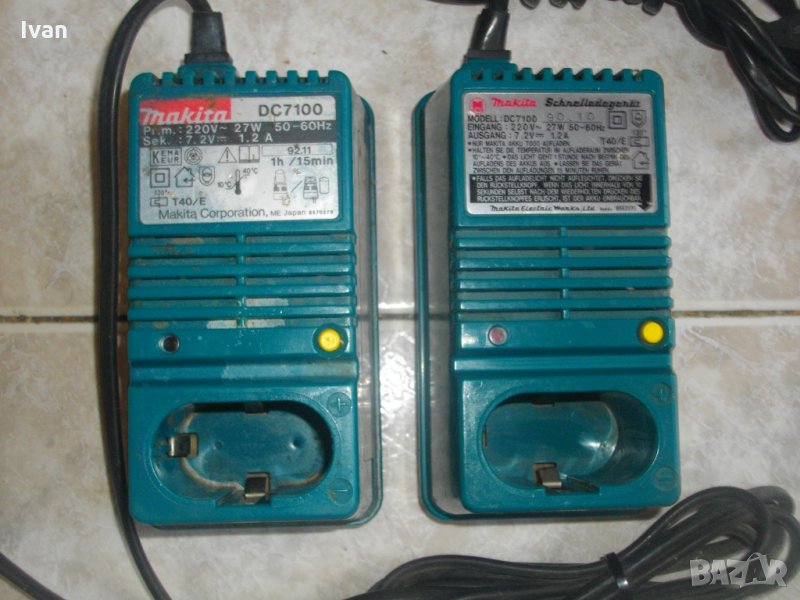 - Makita Corporation - Japan. Много запазен външен вид и техническо състояние - отлично. работя много добре, не загряват, светлинните индикации светят. Характеристики на зарядното - 7, 2 волта, 1,2 ампера, 27 вата. 3 метални букси за зареждане. Светлинна индикация. Захранващ кабел с евро щепсел.