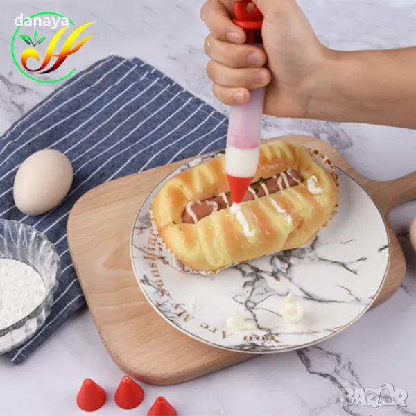 Сладкарска силиконова писалка за украсяване на торти и сладкиши. Шприц със силиконово тяло от типа на писалка за писане. С този сладкраски инструмент с лекота ще напишете надпис по ваш избор. Просто напълнете тубичката с глазура, сметана или друг крем и творете! В комплекта са включени 4 броя накрайници, с които украсата ще бъде винаги различна.