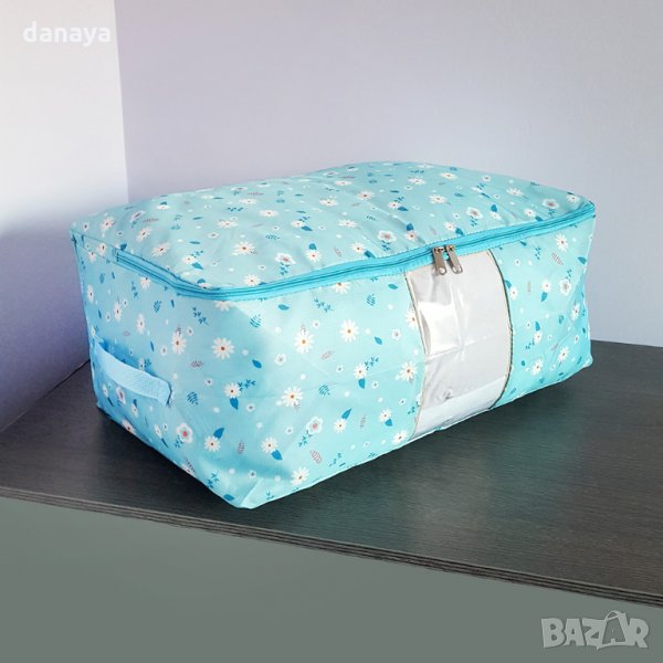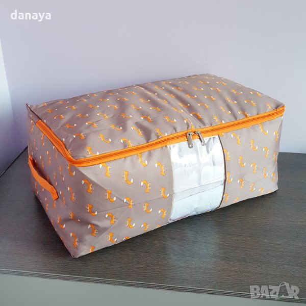 Голям текстилен калъф за съхранение на спално бельо, олекотени завивки, одеала или сезонни дрехи. Калъф за съхранение за под леглото или в гардероба. Предпазва дрехите от прах, изцапване, застояли миризми, докато не се употребяват. Подредените в калъф дрехи са предпазени от вредители, влага, както и от любопитни домашни любимци. Органайзерът се закопчава с цип и има прозрачно джобче на лицевата си страна. Калъфът е достатъчно голям, за да побере 2 олекотени завивки. Този калъф за съхраненние е удобен и при пътуване, той се сгъва няколко пъти и става с размерите на тетрадка, когато не е нужен за употреба. Удобен и практичен органайзер – с няколко калъфа за дрехи ще можете да преорганизирате целия си гардероб, без да се налагат сложни опаковъчни процеси, уреди за вакуум и други, а когато не ви трябват, просто ги сгънете и оставете в шкафа.