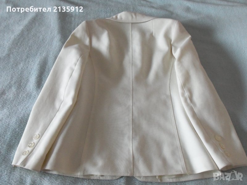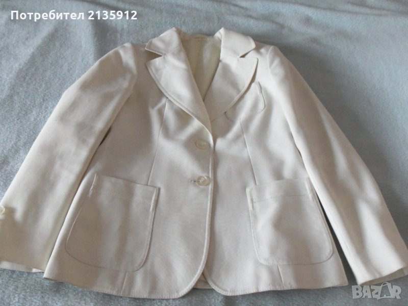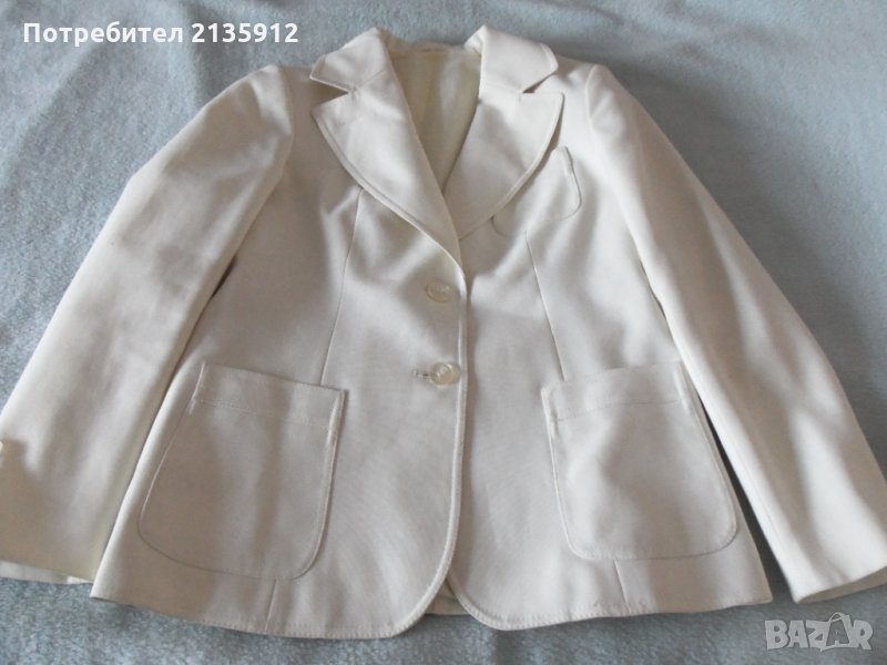 Дамско сако с подплата, цвят слонова кост, плат полиестер,дължина 65см, ширина на гърба 40см,, гръдна обиколка 90см, дълж. на ръкава 60см.
