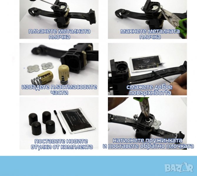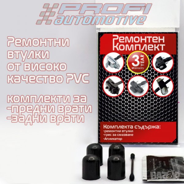 един комплект включва ремонтни втулки за 2 врати (2 предни или 2 задни)