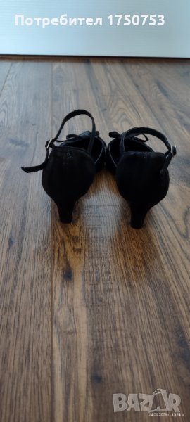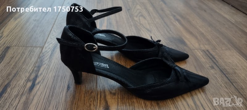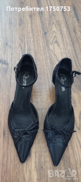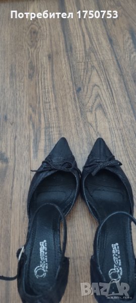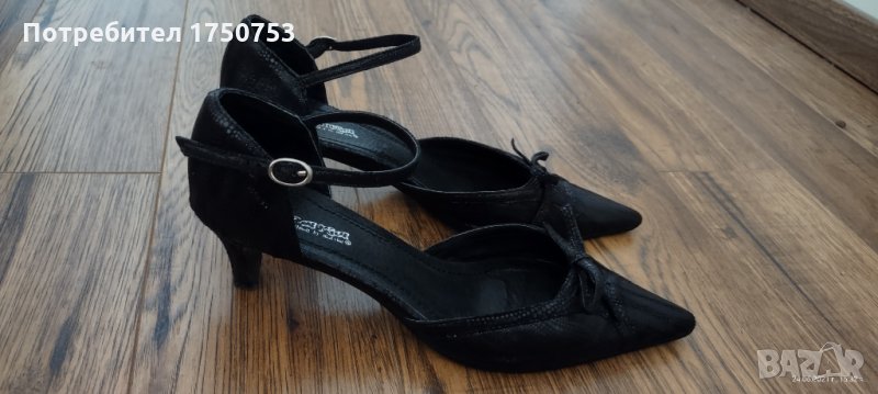 Дамски , стилни , официални обувки на Мat Star. Материал: Велур; Цвят:черен със семпли , малки блестящи точици. Дължина на стелката 21,5 см. Неразличими от нови. Обувани са само на 1,2 официални повода. Токът е нисък , което прави обувките едновременно елегантни и много удобни , като краката не се уморяват.