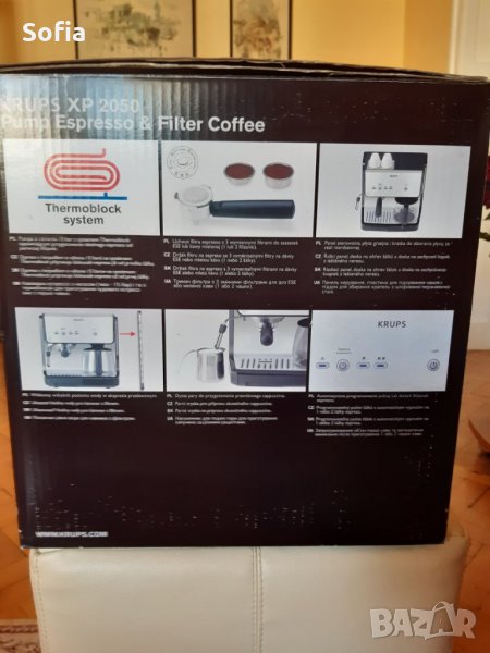 тествана, придобивка неподходящ за нас, голяма ни е, а и филтър кафе не употребяваме.Напълно окомплектова с всичко, с оригинален кашон. Машината е закупена тук, на кашона има етикет-внос от Франция. За Експресо и филтър кафе. С програматор за 1-но или 2 кафета едновременно. Капацитет 10 чаши кафа х 1.25мл- подвижен контейнер. Помпа за налягане 15 bar , което спомага да извлича хубаво кафе.1200w; Парна дюза за капучино,мляко или загряване само. Стабилна ръкохватка с 3 метални диска за кафето, едното е за 1/2ра доза.