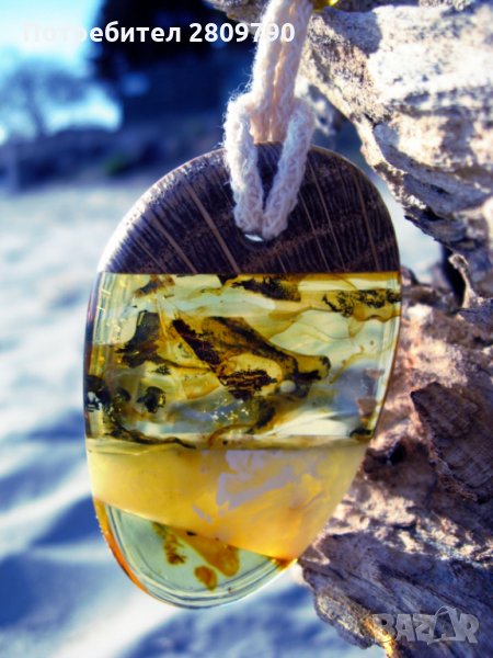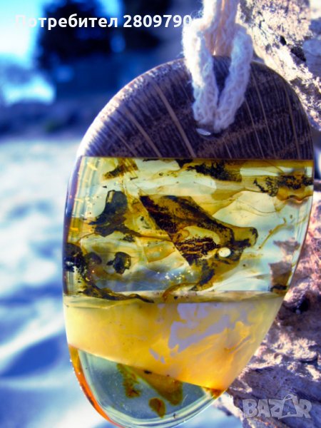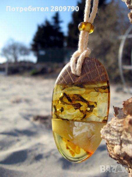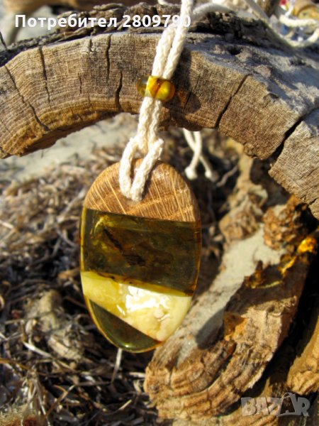 Изключително красива висулка от дърво и 3 различни вида кехлибар. Има муха, замръзнала в едно прозрачно парче кехлибар, и това наистина е най-рядък случай. Такива кехлибарени парчета обикновено могат да се видят само в музей.