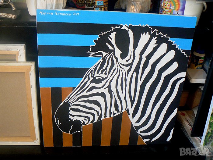 Картина със зебра. Маслени бои върху платно с размери 60 на 60 см. Нарисувана е 2021 г. Художник Мартин Гергински.