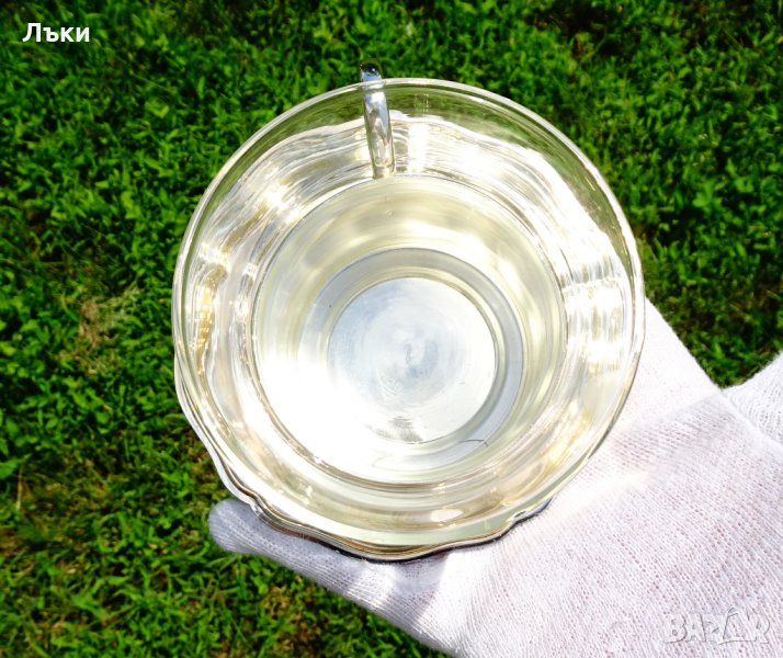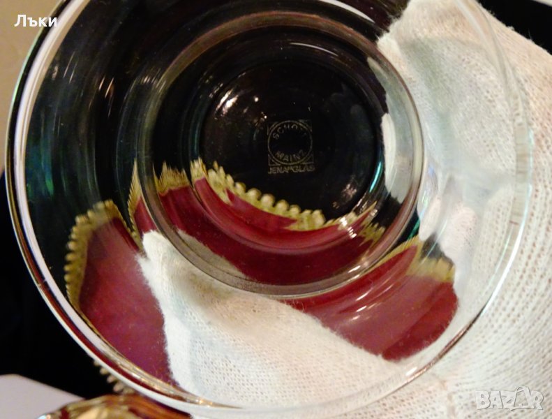 е изработена от термо-стъкло на Jena Glass,маркирана. Подстакана и подложната чинийка са изработени от