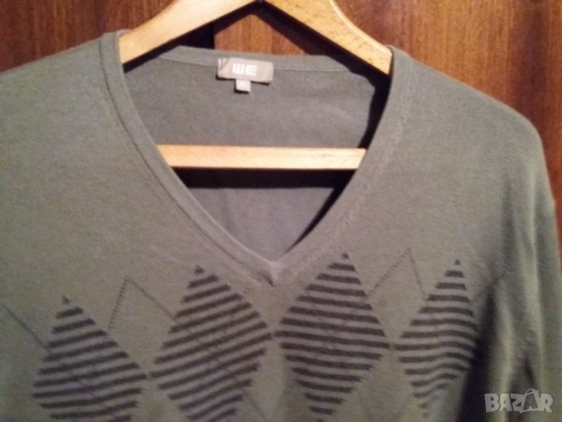 Мъжки пуловер, шпиц деколте, тънък трикотаж на ромбоиди отпред, сивозелен цвят. Размер L-ХL - рамене 50 см, гърди 60 см /120 см обиколка/, дължина 72 см, ръкав 72 см. Отговарям на съобщения тук, изпращам с куриер с отстъпка или лично предаване в София.