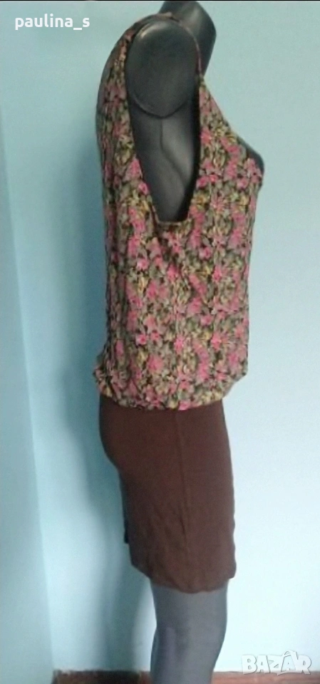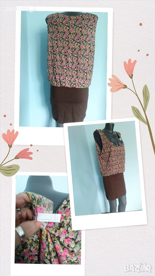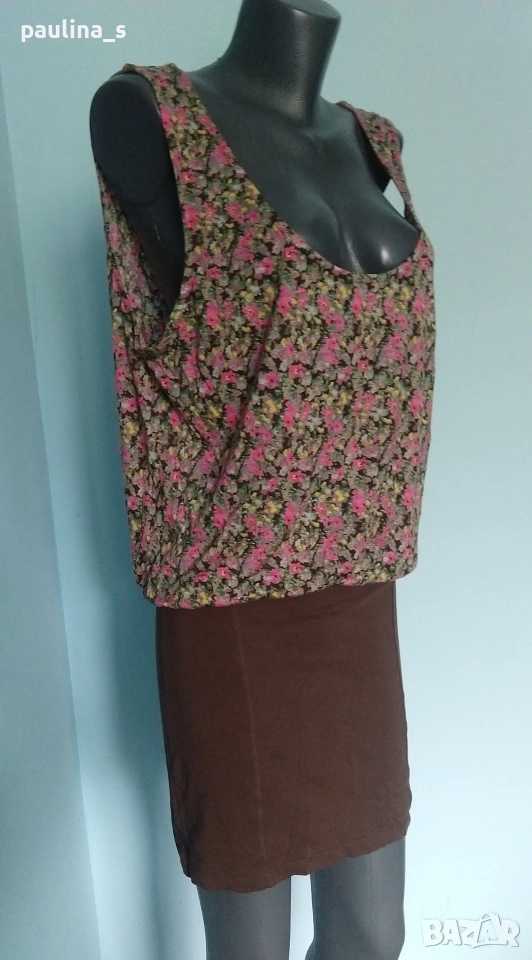 3️⃣. M / XL - "Vero Moda". Цената е крайна, без пазарлъци 9 евро. Весела рокля с широко и лежерно решение на горната част, която може да се носи върху топ или бюстие, долната част е от различно и много стегнато, еластично трико, като мини пола. Материята в долната част е плътно памучно трико и ликра с голяма еластичност, стои добре и в дълбок, и в плитък лежерн на горната част. Горната част е от много фино памучно трико с % вискоза, пада елегантно и ефектно, една бройка, без дефекти, покрива няколко размера.