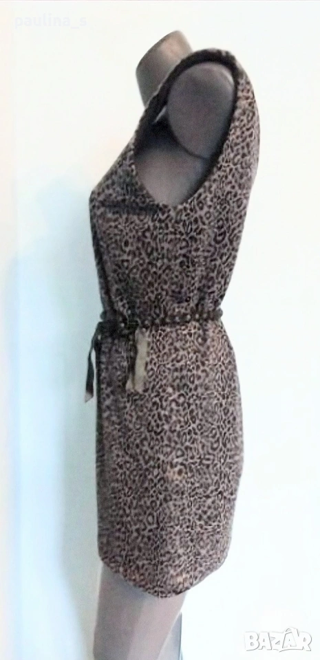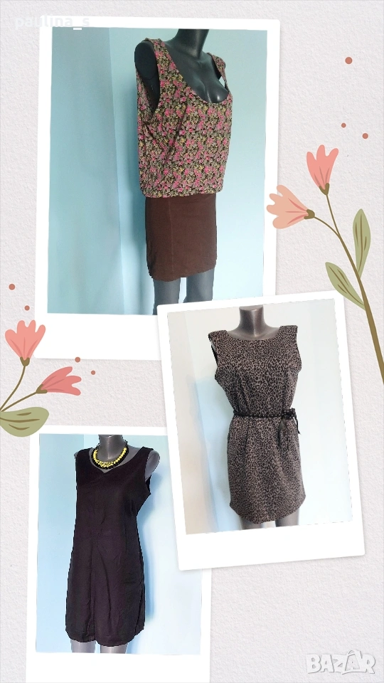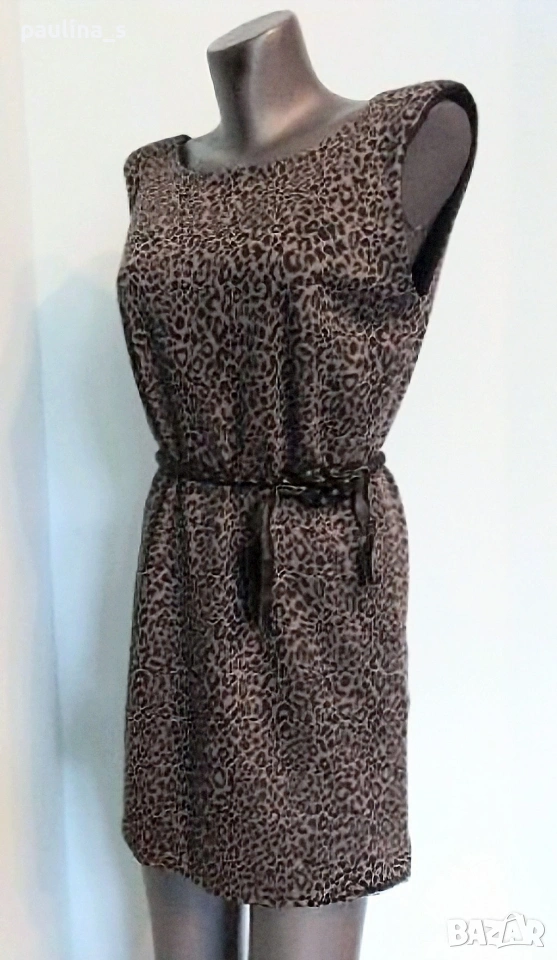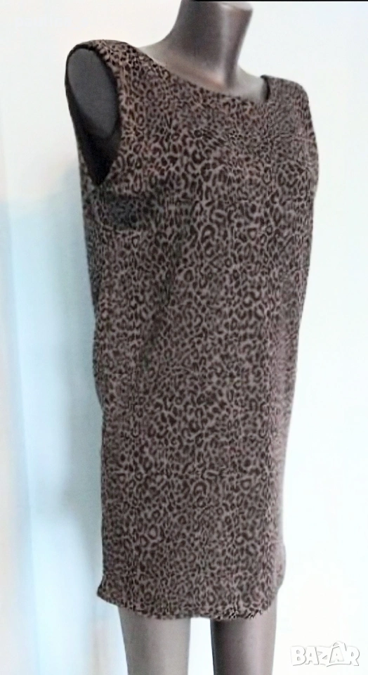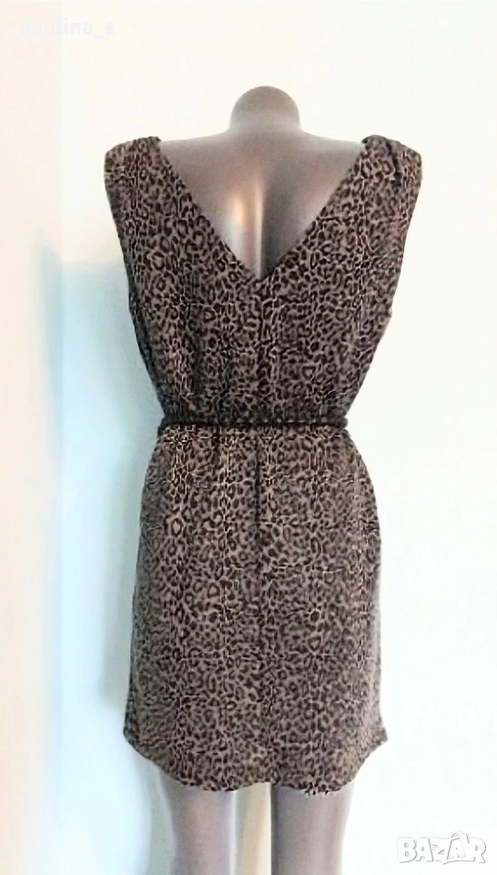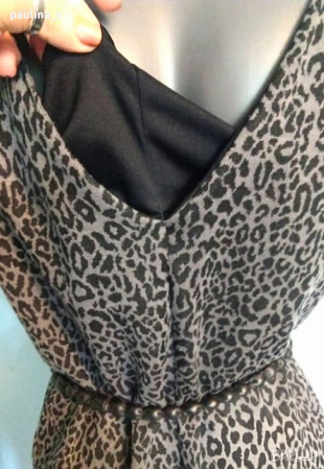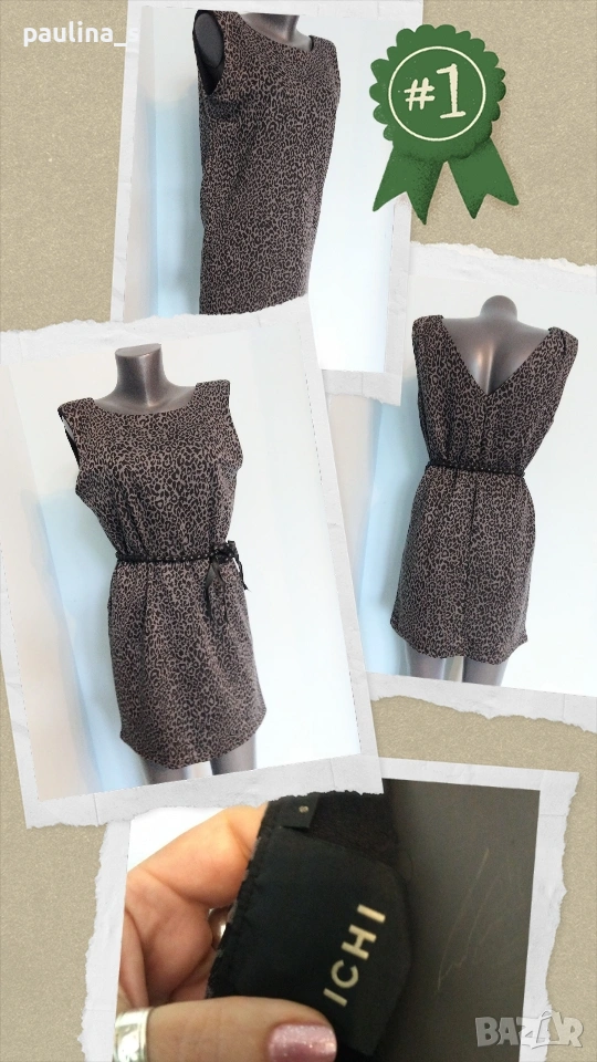2️⃣. Колаж / L / XL - "Ichi". Цената е крайна, без пазарлъци 15 евро. Уникална рокля с отворен гръб в леопардов принт в сиво. Горната част е подплатена, рамената са акцентира и с подложки, доста еластична и покрива няколко размера. Една бройка, нова без етикет. Брандът е за овърсайз дрехи, за това според техните мерки е S.
