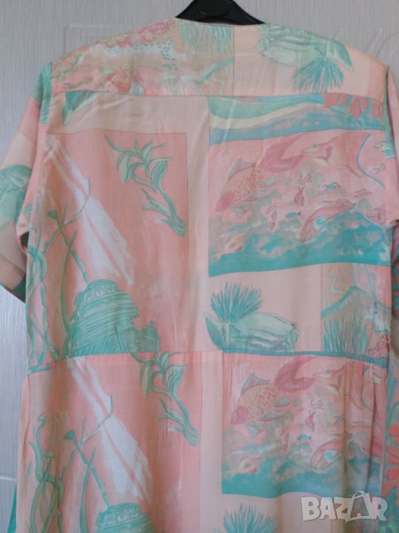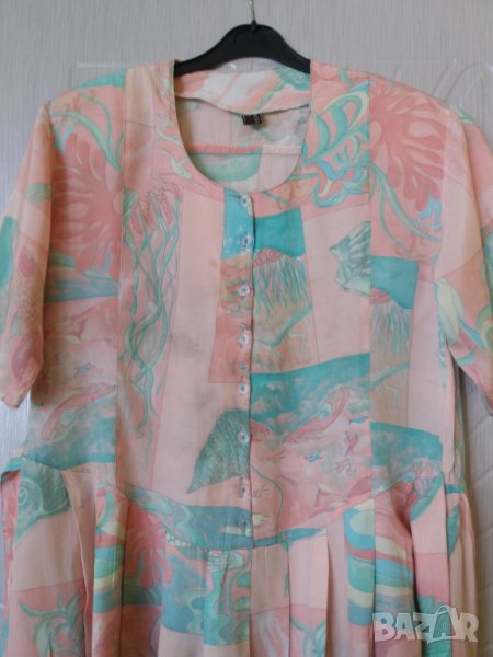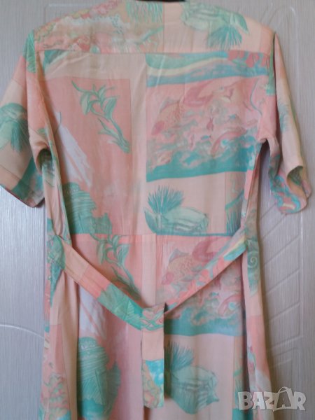 Лятна рокля с къс ръкав Мода Италия, с подплънки в раменете, рязана в талията с удължено отпред и отзад, копчета горе до талията, има коланче което може да се връзва отпред или отзад, от талията надолу има лек набор на плисета. Цвят съчетание от прасковено розово и резидаво зелено. Размер около XL-2XL /според фигурата/, рамене 46 см, гърди 54 - 56 см /или 108-112 см/, талия 54 см /или 108 см обиколка/, ханш - до 76-78 см /или 152 - 156см/, дължина 110 см, ръкав 26 см. Отговарям на съобщения тук, изпращам с куриер с отстъпка, преглед и тест, или лично предаване в София.