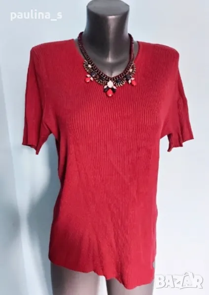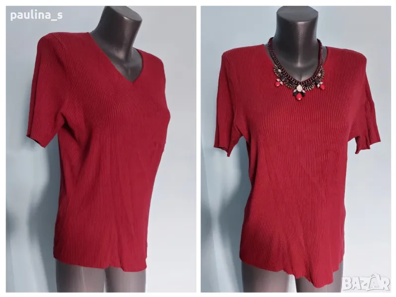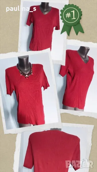 3. Колаж / L / 3XL / Червена блуза с остро деколте. Цената е крайна 14,99лв. Много еластична червена блуза с V-образно деколте, къс ръкав и с леко втален силует, премахнат етикет. Моделът е класика в жанра, материята е вискозна коприна и полиестер, доста еластична, мекичка, хипоалергична и покрива няколко размера до 4/5XL. Алергичните и капризна кожи на дами с диабет, лупус, екземи или други, се обрижват с подходящи материи. Дрехата е без дефекти.