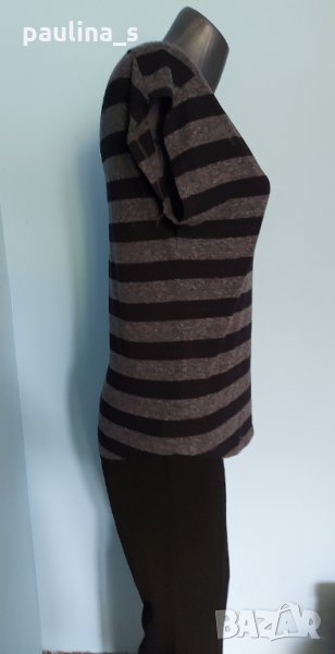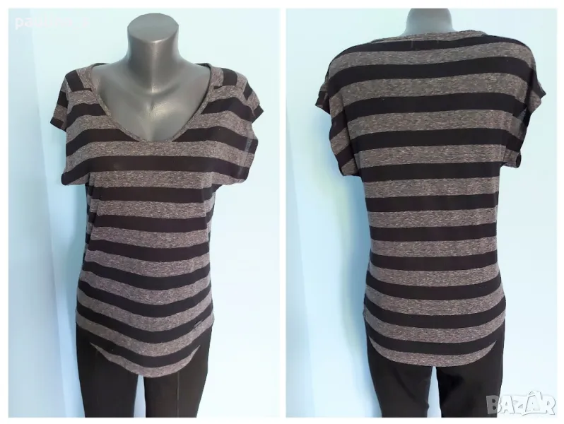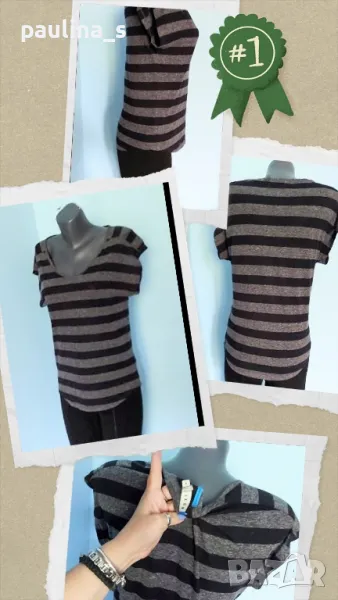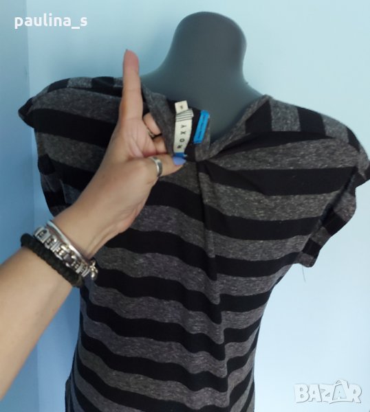 1. Колаж / M / 2XL - "Roxy". Цената е крайна 8,99лв. Дамска блуза, тип тениска или туника в черно сиво райе, материята е полиестер. Моделът се вижда добре, с извити предни и задни части.