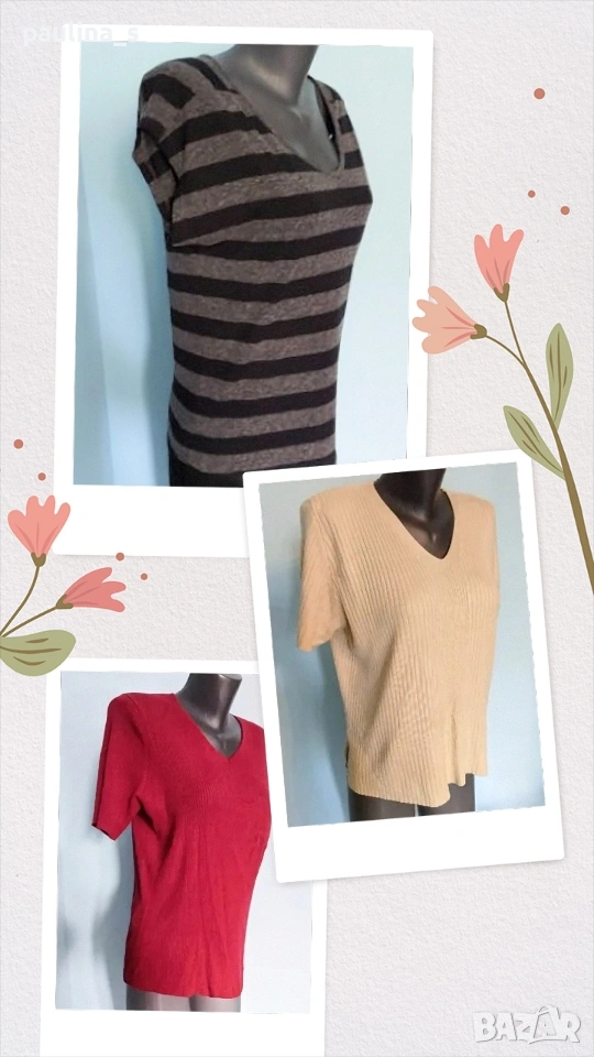 2️⃣. Колаж / L / 3XL / Червена блуза с остро деколте. Цената е крайна, без пазарлъци 7,5 евро. Много еластична червена блуза с V-образно деколте, къс ръкав и с леко втален силует, премахнат етикет. Моделът е класика в жанра, материята е вискозна коприна и полиестер, доста еластична, мекичка, хипоалергична и покрива няколко размера до 4/5XL. Алергичните и капризна кожи на дами с диабет, лупус, екземи или други, се обрижват с подходящи материи. Дрехата е без дефекти.