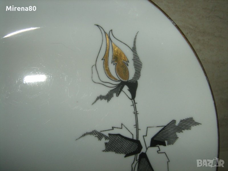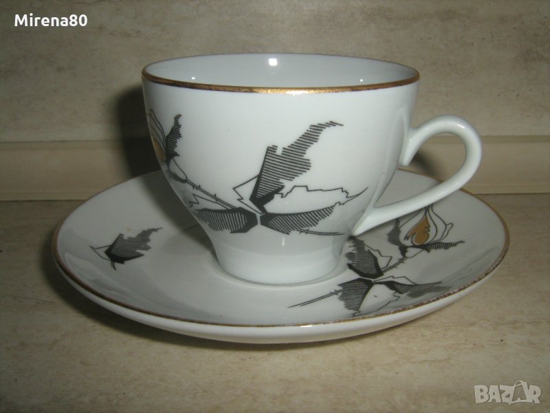 черна роза и злато - супер стилна и изчистена комбинация. Порцеланът е баварски, супер лек и фин (прозира срещу светлина). Чашата е с перфектна големина и форма - голяма, но елегантна и удобна. Чашата е с перфектен златен кант, чинийките имат след от употреба по канта - цената е съобразена с това. Налични няколко сета !