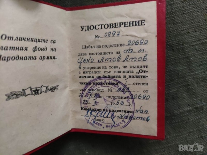 Продавам удостоверение за значка Отличник по бойна и политическа подготовка поделение 20690 → Обява 33352680