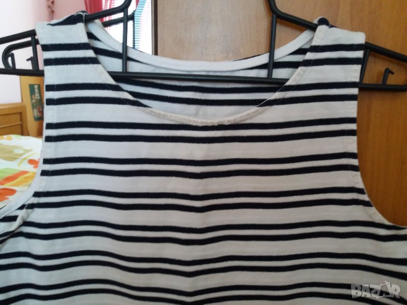 Блузка без ръкав потник на райета бяло и черно. Размер М, бюст 44 см отпред /88 см обиколка/, дължина 54 см. Материята е еластична. Отговарям на съобщения тук, изпращам с куриер с отстъпка, преглед и тест, или лично предаване в София.