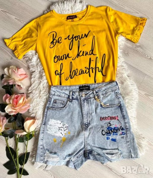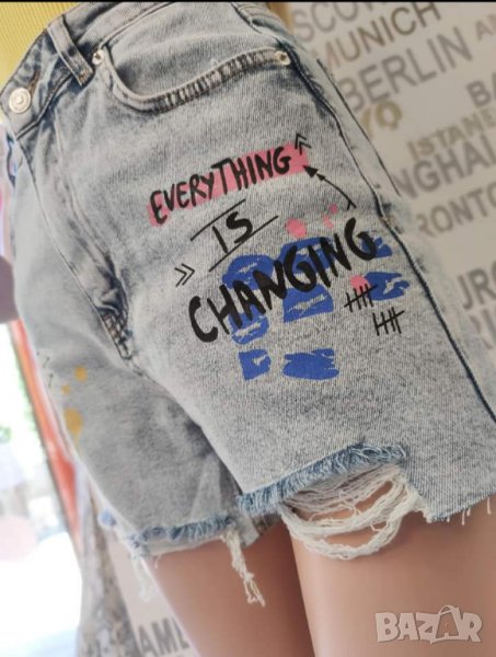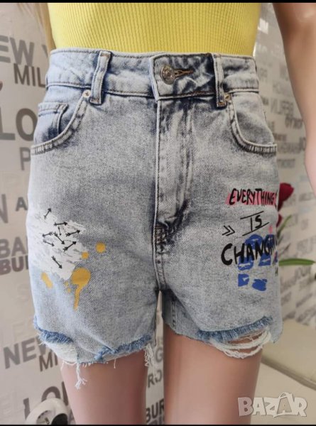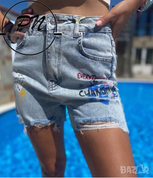 Дамски къси дънки с накъсан ефект и надписи - 98 %памук ,2%еластан - обличани са броени пъти