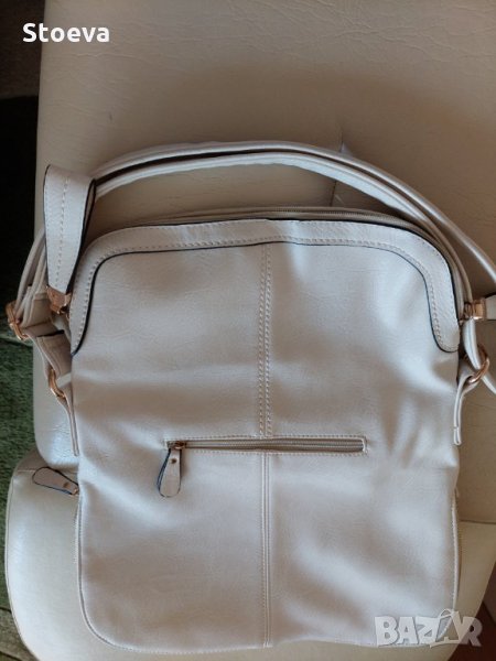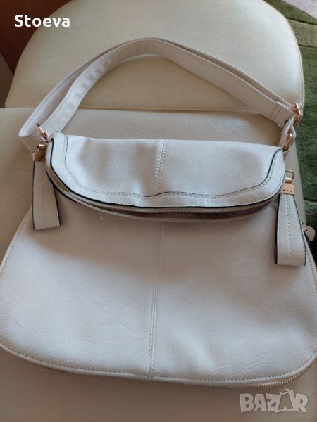 Дамска светло бежов чанта-екрю .Отлично състояние , дълга дръжка за през рамо , цип за уширение на дъното , заден външен джоб с цип . Два вътрешни джоба за телефон и документи , две вътрешни отделения , едното с цип , вътрешен джоб с цип . Размери - 38х26 с паднал капак , 45х38 - разгъната , уширително дъно 9 см , хастар – полиестер .