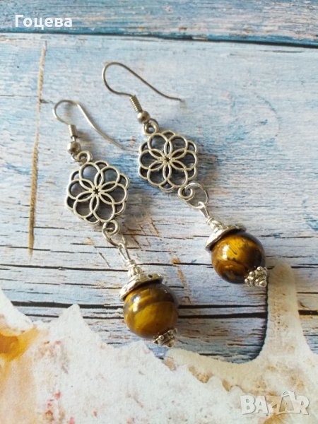 Красиви Бохо обици с прекрасни камъни Тигрово око и ажурни орнаменти в цвят Сребро → Обява 33371236