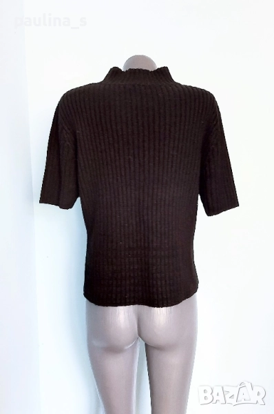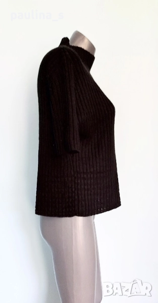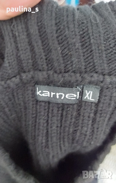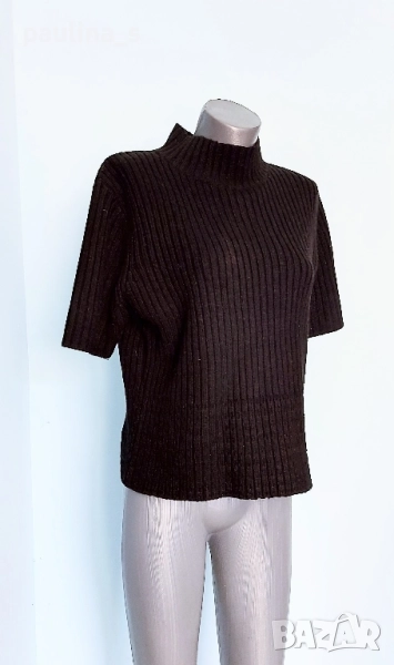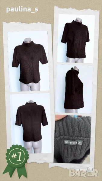 2️⃣. Колаж / L / 3XL - "Karnel". Цената е крайна 24,99лв / 12,5 евро. Черен вълнен пуловер с къс ръкав и висока полуполо яка, може да се носи самостоятелно или върху друга блуза или пуловер, голям размер. Преждата е със съдържание на вълна. Изключително прецизна изработка, удобна дреха, не се степва и има голяма еластичност, в долната част плетивото наподобява на дантела. Като нов.