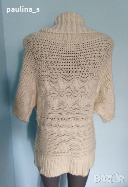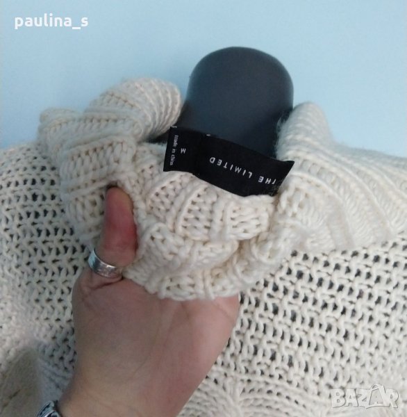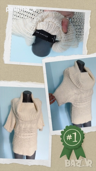 1️⃣. Колаж / M / XL - "The limited". Цената е крайна 29,99лв / 15 евро. Марков пуловер тип туника с щедра яка - turtle neck. Плетивото е с хоризонтално резположени плетеници и падащи ръкави, рехаво е и дава еластичност, покрива няколко размера, като гръдната обиколка влиза в ръкава и може да се носи от няколко размера. Преждата е вълна и примеси, не се степва, а е лека, обемна е и топли. Като нов, без дефекти и етикет.