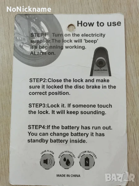 Натиснете бутона на ключалката, тя ще се заключи и ще чуете звук "DU", което означава, че влиза в състояние на аларма, след 5 секунди. Когато ключалката или превозното средство вибрират, ключалката ще издаде аларма "DU DU DU" три пъти. Когато ключалката вибрира отново, след 5 секунди ще се задейства аларма и ще се поддържа с поредна вибрация. Всяка аларма ще продължи 10 секунди.