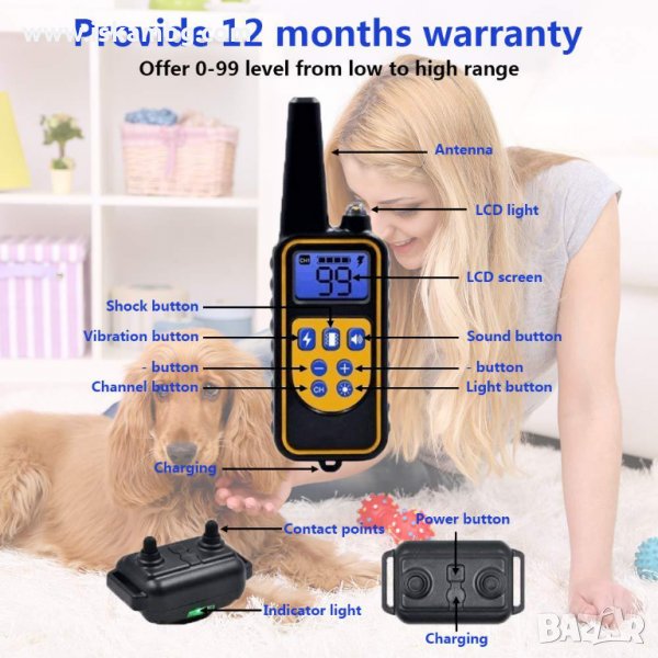 Този напълно водоустойчив нашийник е много популярен сред кучешките треньори и собствениците на домашни любимци. Системите за обучение ще ви помогнат да контролирате и обучите кучето си в ефективен диапазон чрез поредица от функции, включвщи: вибрация, звуково предупреждение, електростатичен електрошок. Това е добър асистент за обучение.